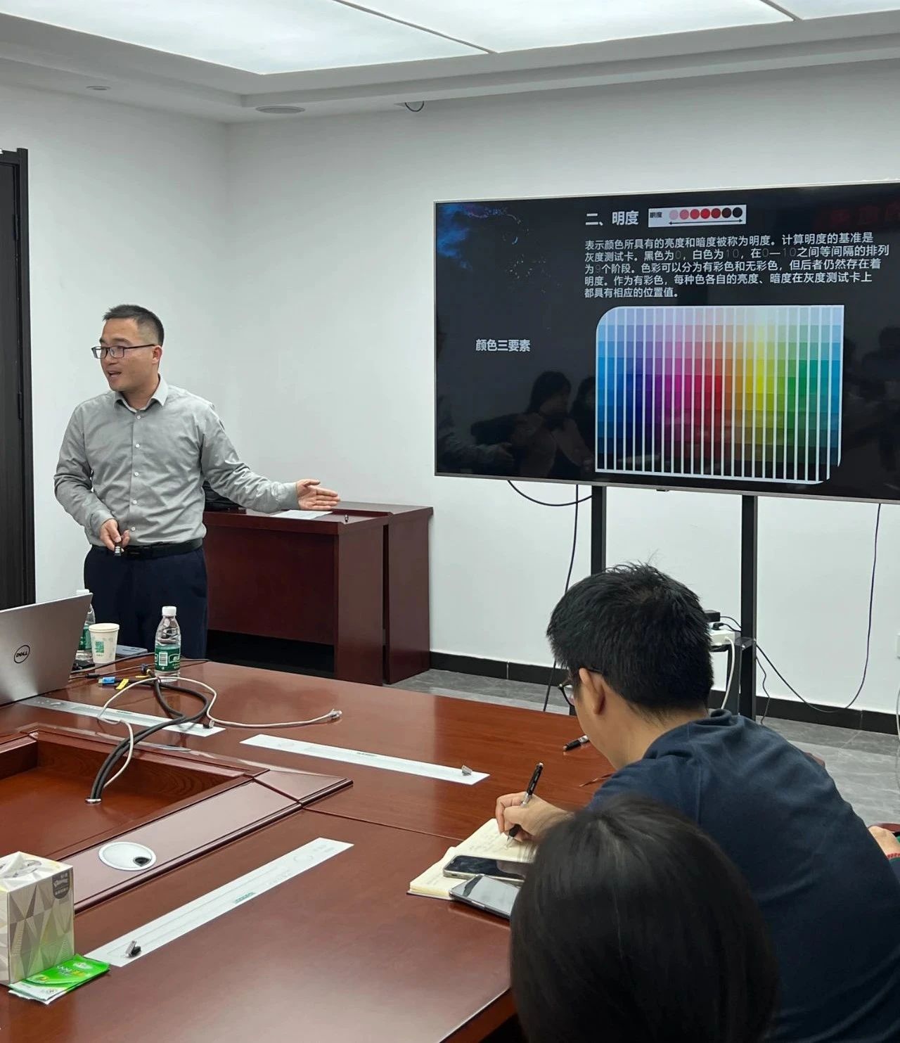 培训伊始,集团内训师孙光壁讲师在讲解色彩理论基础时,用通俗易懂的方式介绍了色彩的基本属性:色相、明度和纯度。通过“色彩轮”辅助工具,向学员们阐述了互补色、邻近色等色彩关系,以及它们在视觉效果上的差异。强调了互补色搭配能创造出强烈的视觉冲击,可用于突出重点信息;而邻近色搭配则能营造出和谐统一的氛围,适合表现稳定、舒缓的内容。